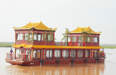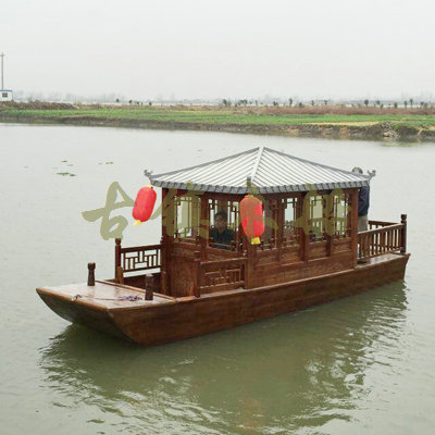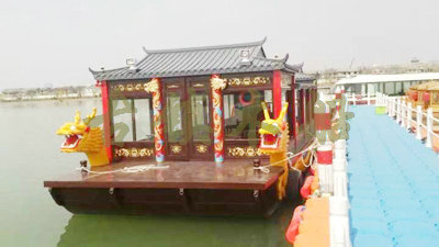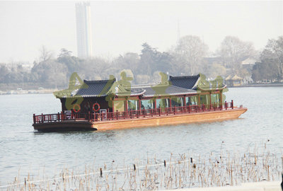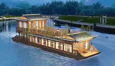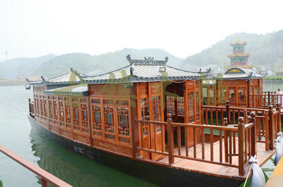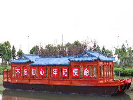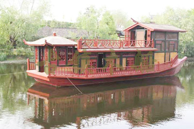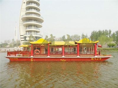 畫舫船就是裝飾古典華麗的游船,是"中國(guó)風(fēng)"的仿古游船,結(jié)合古典園林建筑,體現(xiàn)了中華文明的古典藝術(shù).畫舫船豪華而又古典,船上的建筑按照中國(guó)古代建筑里的亭臺(tái)樓閣,建筑工藝之復(fù)雜,要求之嚴(yán)格,仿古畫舫游船的特點(diǎn)飛檐翹角、玲瓏精致的四角亭子逐漸成形,赫然立于船頭,美人靠、盤龍柱子、彩畫……龍柱上的浮雕盤龍和祥云一層扣著一層,層層錯(cuò)落有致,雕刻精細(xì)到盤龍身上的每一個(gè)鱗片都細(xì)細(xì)可數(shù),古代皇家標(biāo)志性元素,在畫舫船上體現(xiàn)的淋漓盡致。除了雕刻、花窗,整條船還有一個(gè)看點(diǎn),那就是弧線優(yōu)美、高高翹起的船尾。游船并不大,長(zhǎng)約10米、寬3米,但是整體看起來堪稱一件藝術(shù)品。船尾的雕花欄桿與船艙、船頭的雕刻遙相呼應(yīng),船身四周貼著浮雕祥云,給整條船增添了富貴、華麗的氣質(zhì)。